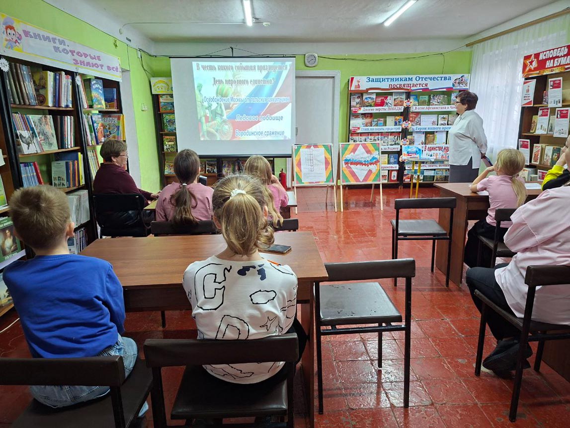 4 ноября в России ежегодно отмечают День народного единства. Этот праздник, установленный в 2005 году, напоминает нам о важном историческом событии - освобождении Москвы от польских интервентов народным ополчением в 1612 году. День народного единства занимает особое место среди государственных праздников. Он вдохновляет нас не только вспомнить великие исторические моменты, но и осознать, как важно единство нашего многонационального народа. Именно благодаря сплоченности и мужеству предков мы одержали победу. В преддверии праздника Детская библиотека им. А. С. Пушкина МУК «РМЦБ» провела час истории «Смутное время на русской земле». Дети в доступной форме узнали о событиях того времени и подвигах наших предков, защищавших Родину.