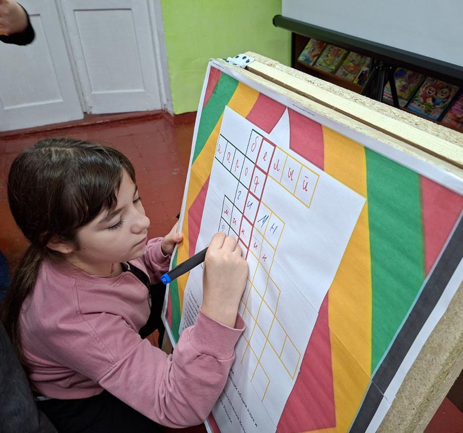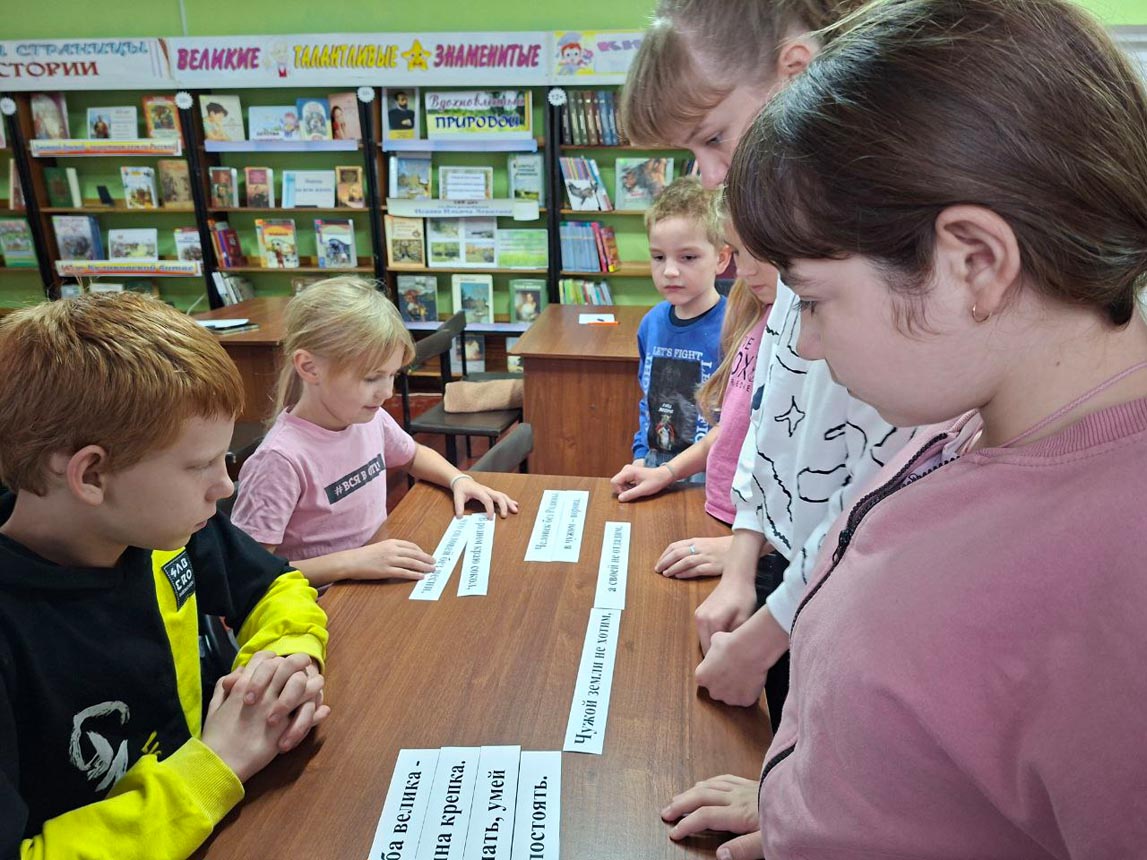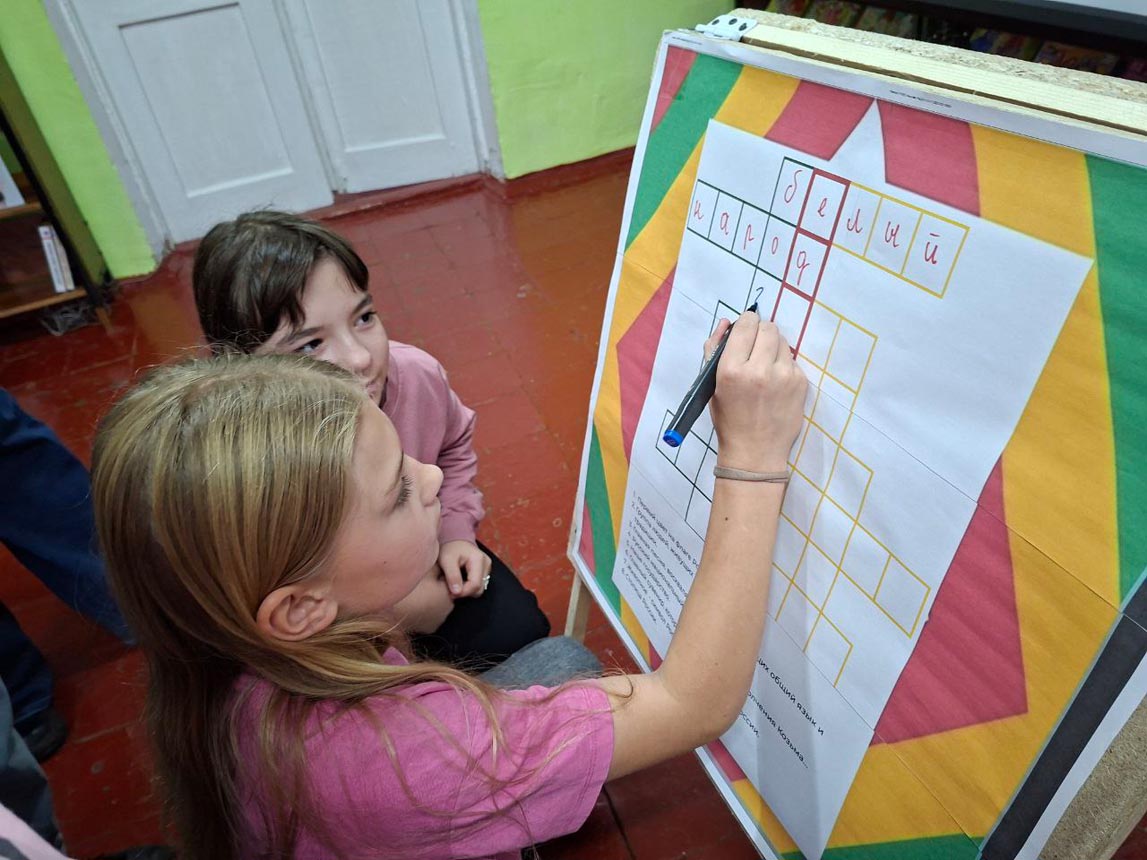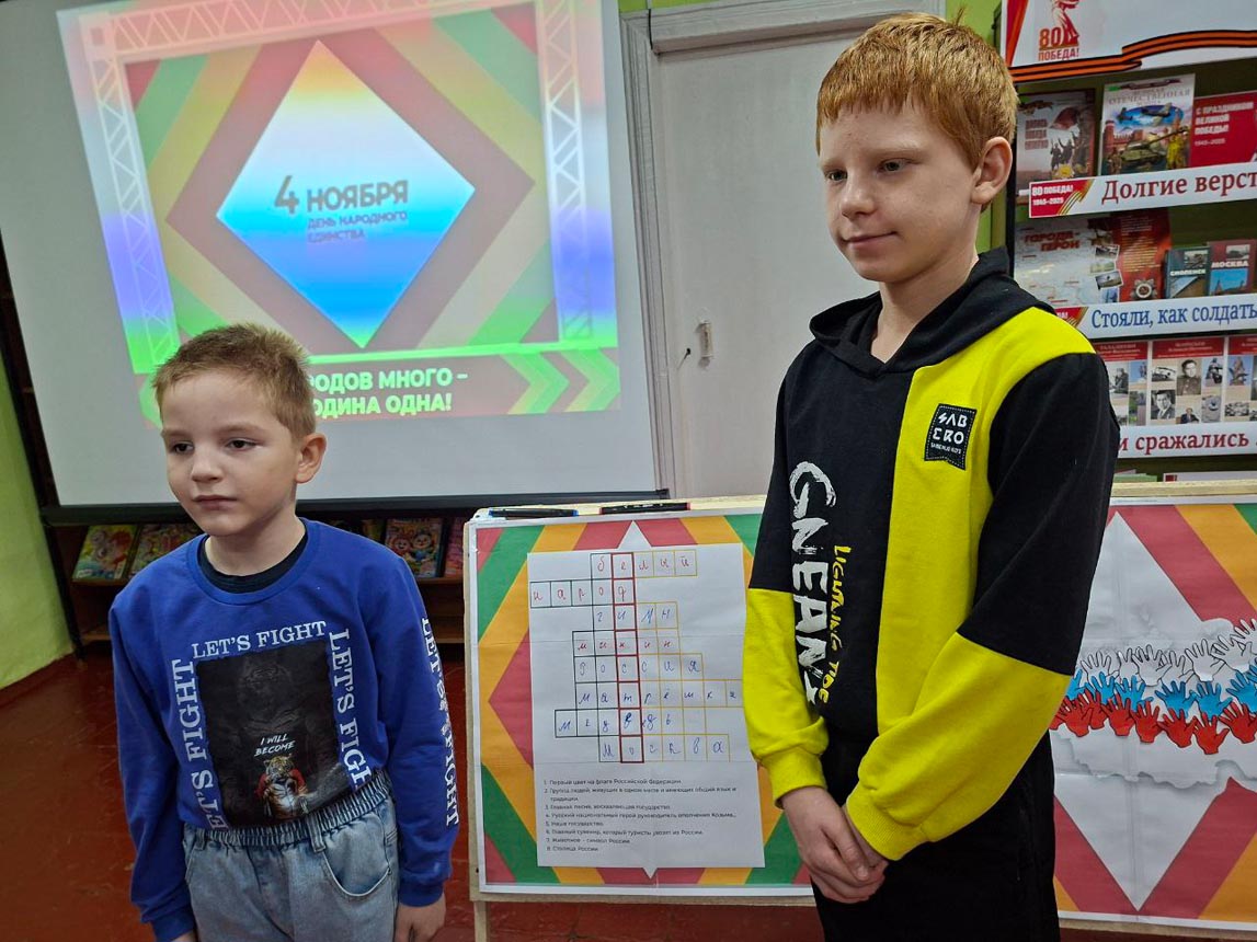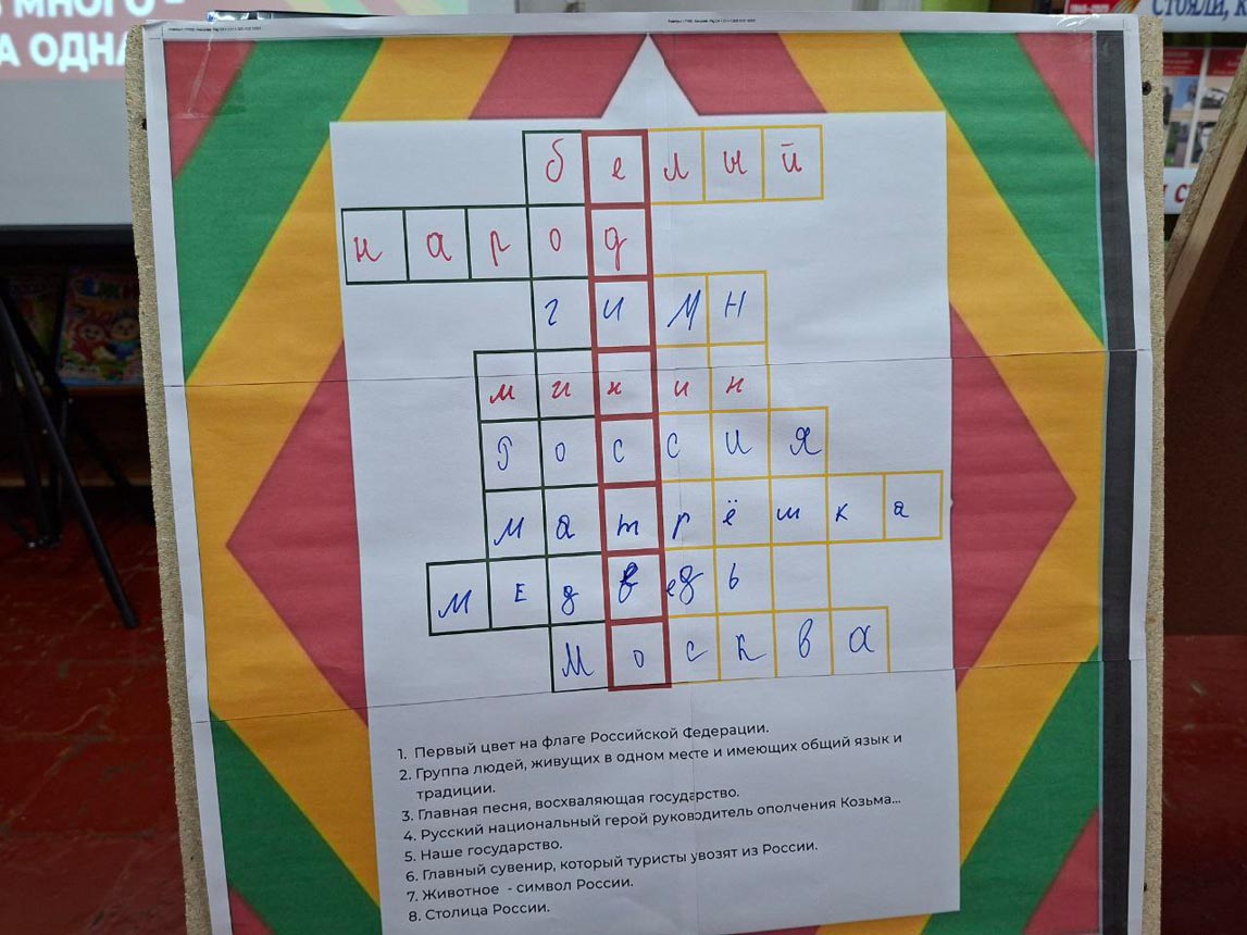 После небольшой разминки ребята приступили к увлекательным заданиям. Они раскрасили карту России в цвета триколора, отгадали ключевое слово «Единство», ответив на вопросы кроссворда. Также ребята собирали пазлы сказок народов России и расшифровывали их названия. А в завершение мероприятия проверили свою внимательность, ответив на вопросы итоговой викторины.