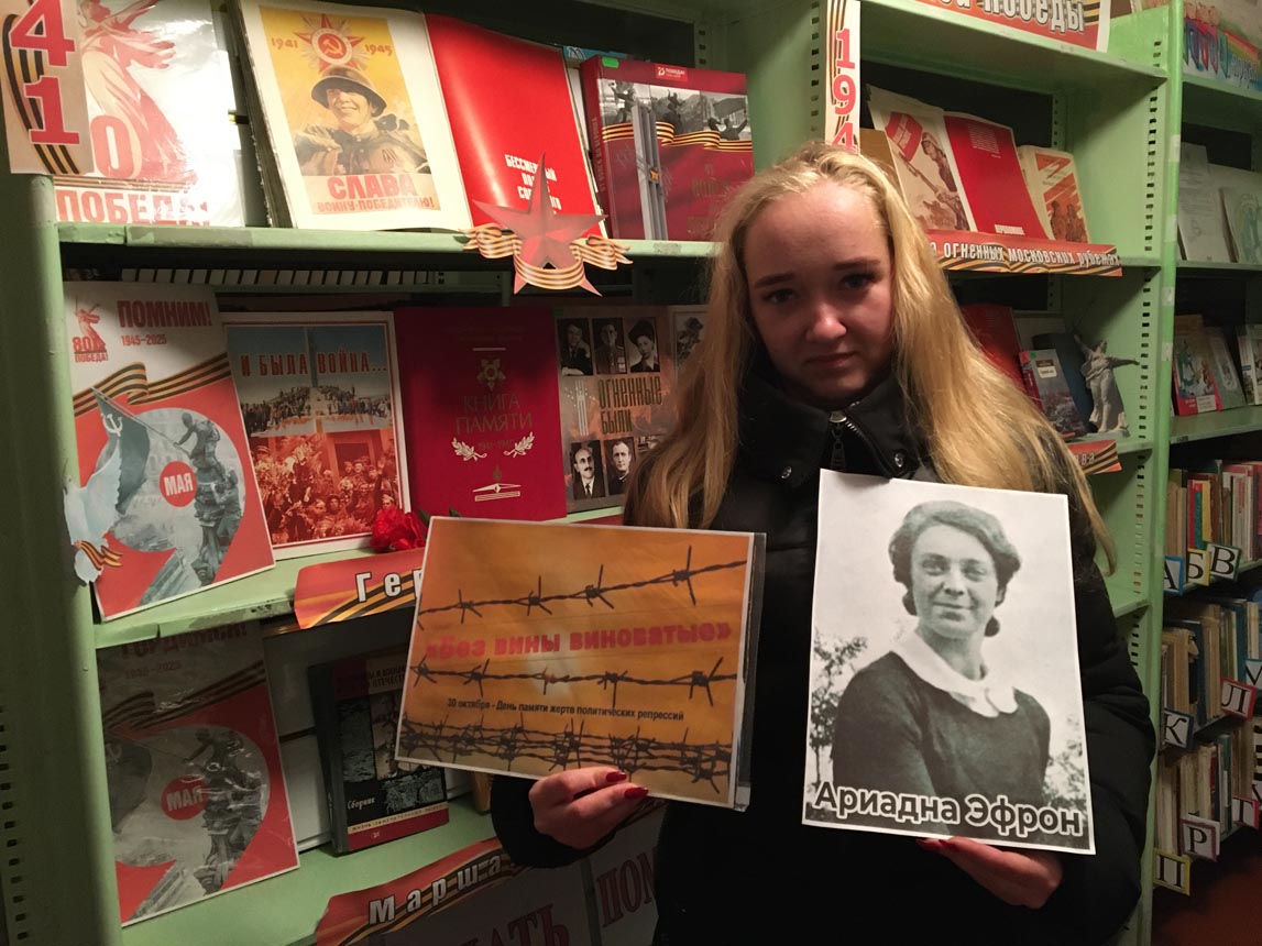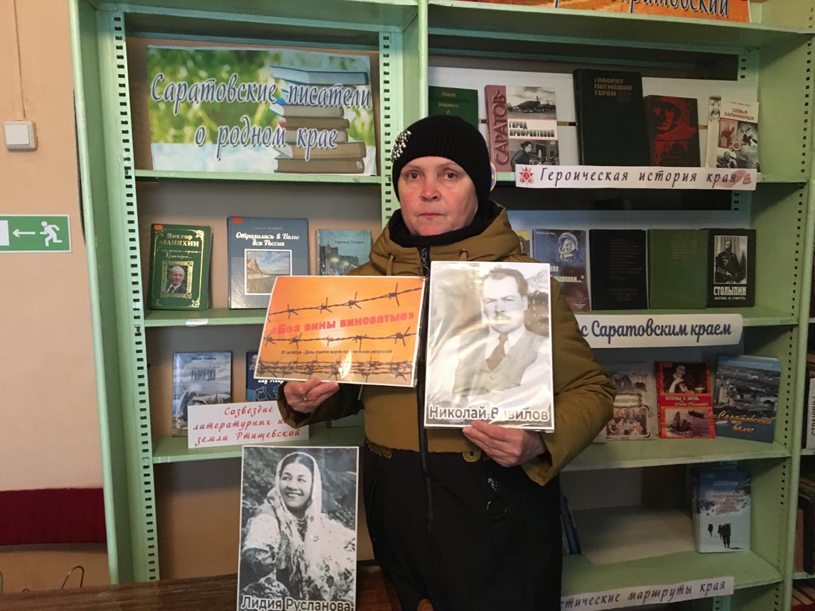 В календаре памятных дат России есть особенные дни скорби. Один из них - День Памяти жертв политических репрессий, посвящённый событиям, которые невозможно вычеркнуть из истории страны, потому что они касаются многих российских семей. Миллионы людей были необоснованно подвергнуты репрессиям, обвинены в преступлениях и лучшие годы своей жизни вынуждены были провести в исправительно- трудовых лагерях, в ссылках, миллионы лишены жизни. Чтобы россияне не забывали об этой трагической части нашей истории, был установлен специальный День памяти. К Дню Памяти жертв политических репрессий Газопроводская сельская библиотека МУК «РМЦБ» пригласила читателей на час памяти «Без вины виноватые». Библиотекарь рассказала историю установления памятного Дня - дата была выбрана в память о голодовке узников лагерей, начавшейся 30 октября 1974 года в Мордовии, которую политзаключённые объявили в знак протеста против политических репрессий в СССР; собравшимся было напомнено о чёрных страницах истории страны: что такое репрессии и в какой период они происходили, сколько человек на самом деле пострадало. Говорили о тяжёлом и суровом времени - о годах сталинского культа и беззакониях. Ощутить весь ужас репрессий довелось не только рядовым советским гражданам, но и видным деятелям науки, искусства. Библиотекарь рассказала об известных писателях, поэтах, актёрах, учёных, артистах, подвергшихся репрессиям. Читатели узнали о страшной судьбе великого учёного- биолога Николая Вавилова, о жизни любимца публики, народного артиста СССР Георгия Жжёнова, познакомила с трагическими эпизодами из биографии С. Королева, Л. Руслановой, А.Туполева, А.Солженицына. Участники мероприятия с уважением и признательностью вспоминали этих замечательных, без вины виноватых, людей. Минутой молчания почтили память безвинно погибших.