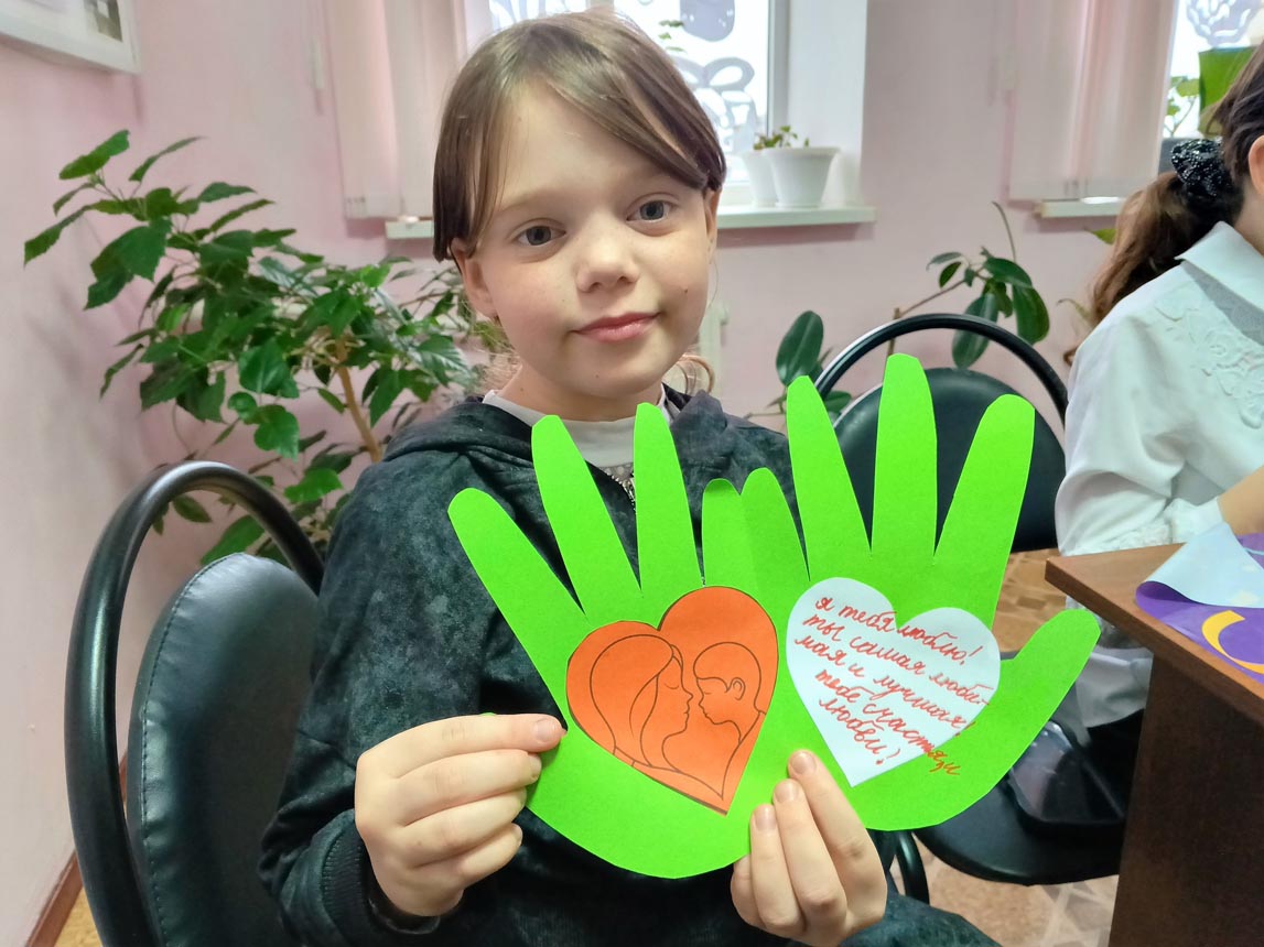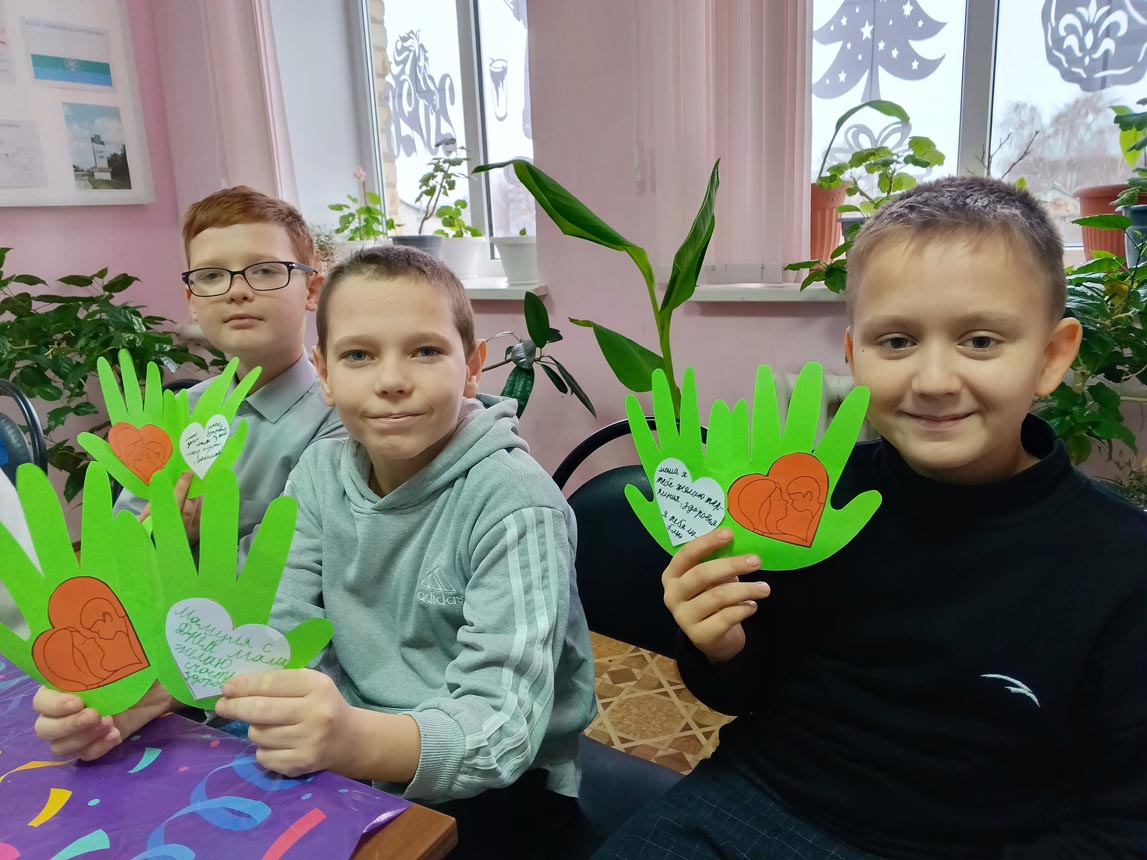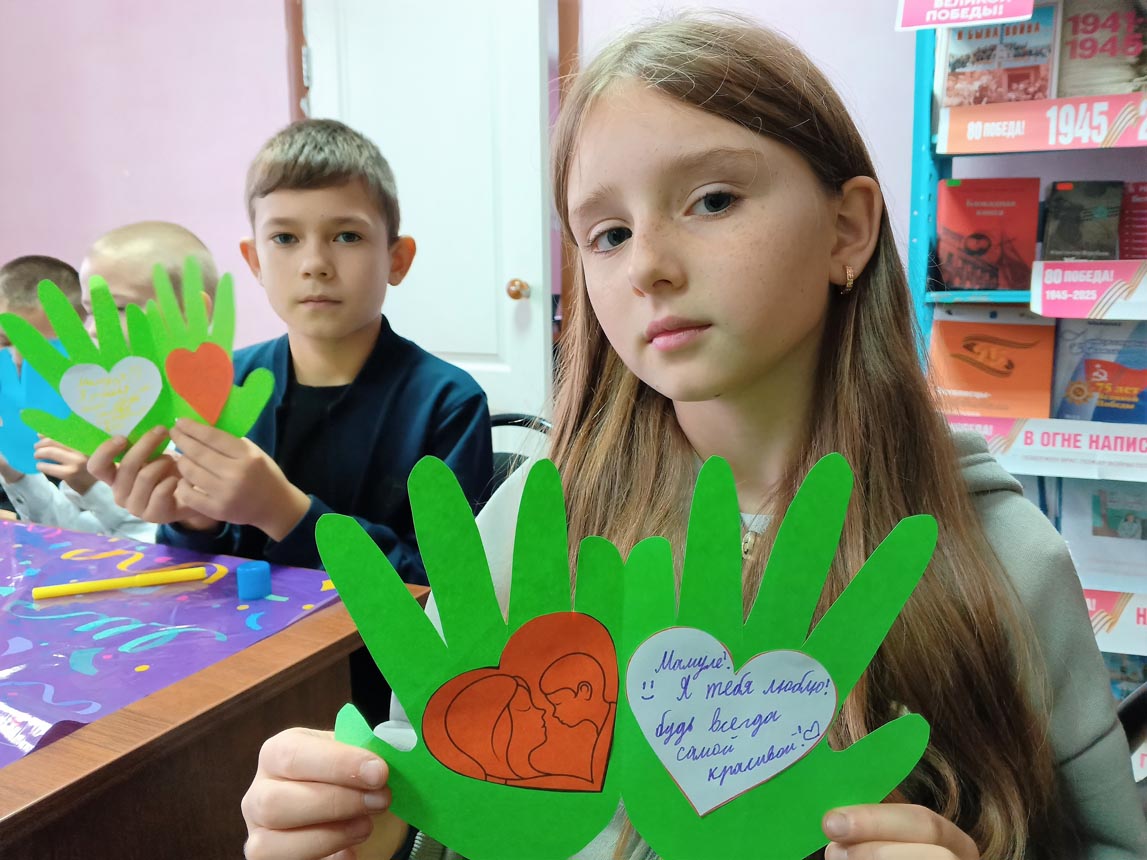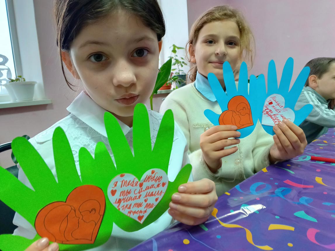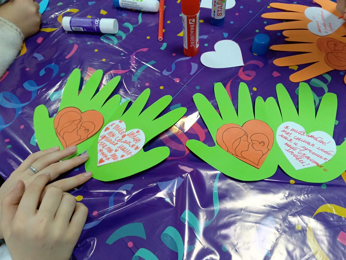 Мальчишки и девчонки с удовольствием мастерили поделку из цветной бумаги, обведя свои руки, внутри на каждой ладошке приклеили сердечки и написали теплые пожелания для своих мам.
