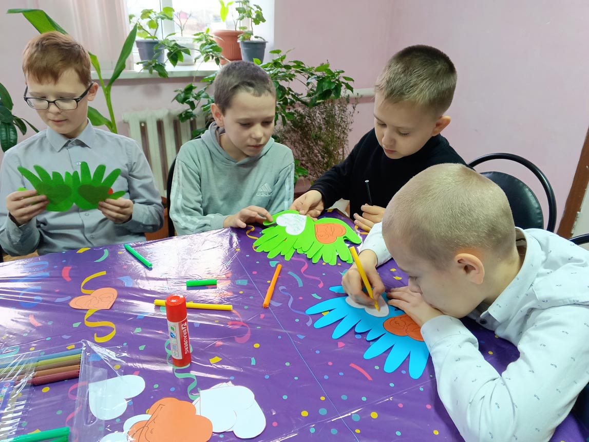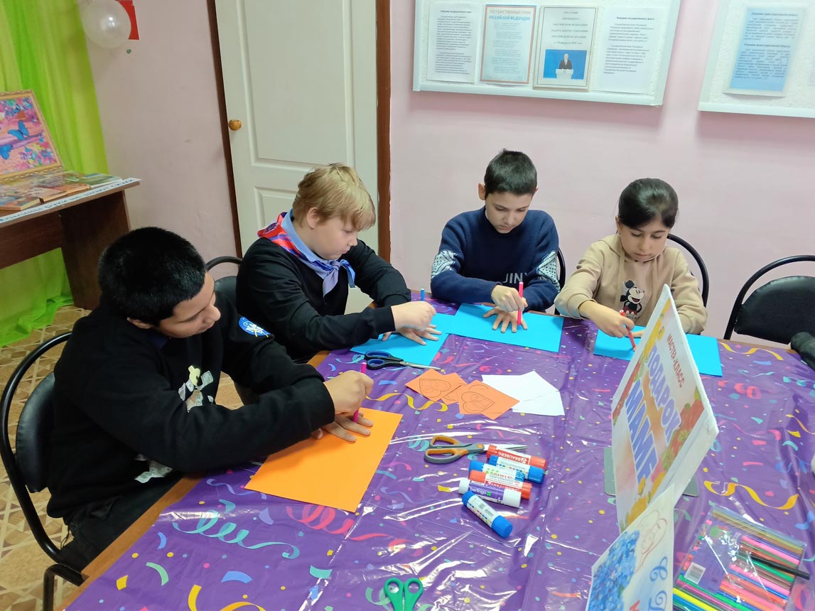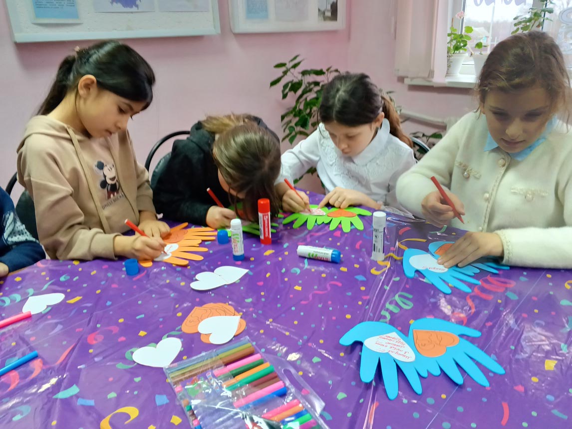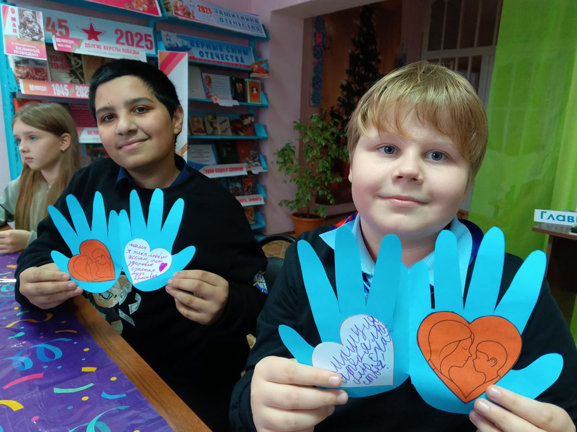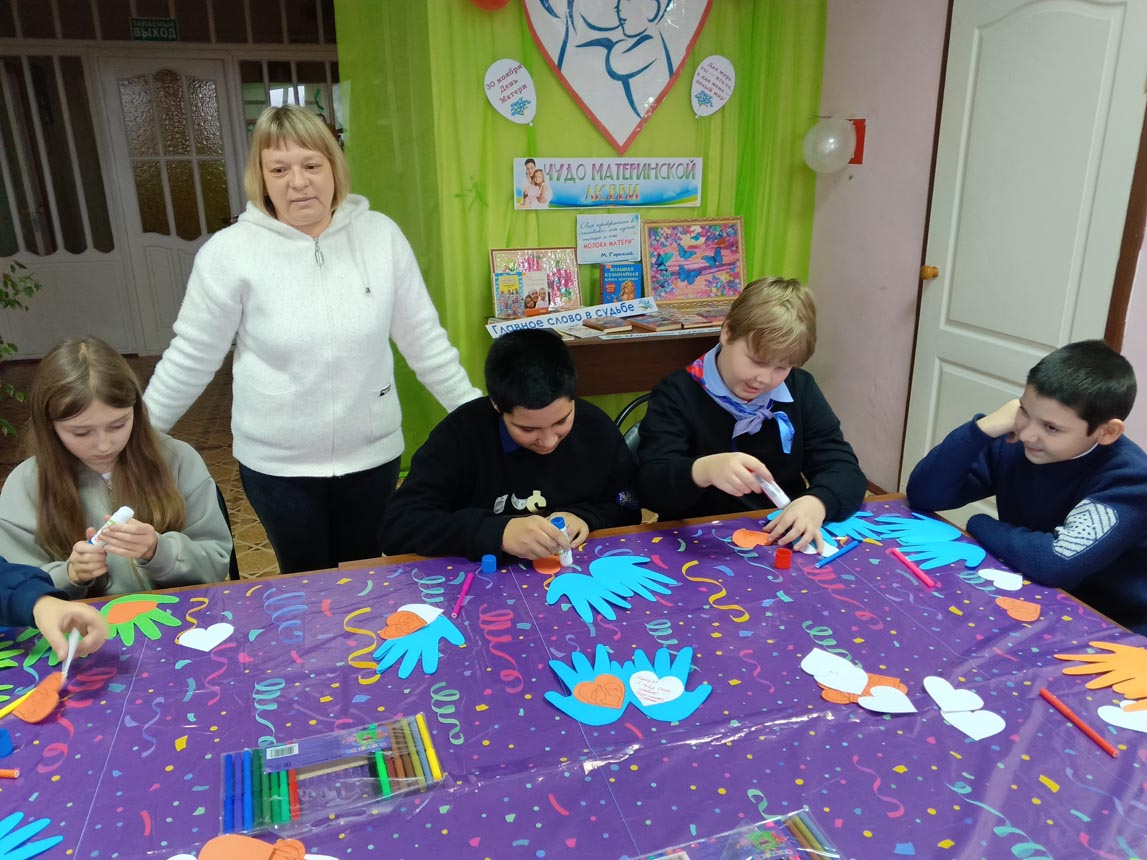 Мальчишки и девчонки с удовольствием мастерили поделку из цветной бумаги, обведя свои руки, внутри на каждой ладошке приклеили сердечки и написали теплые пожелания для своих мам.