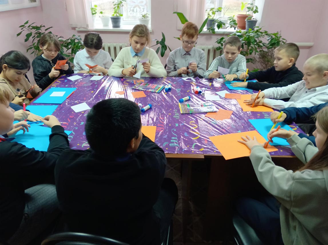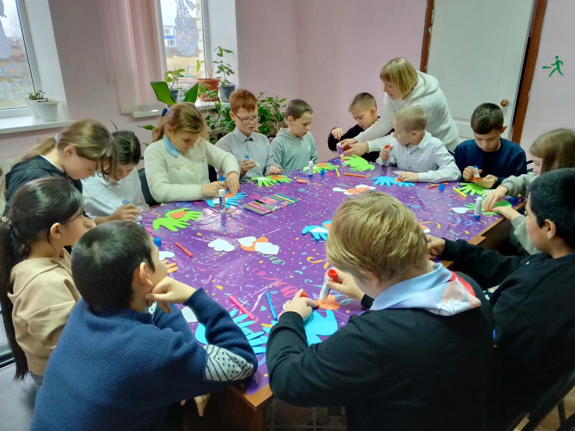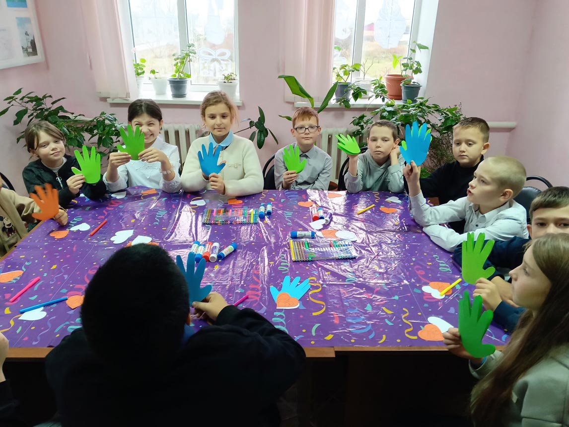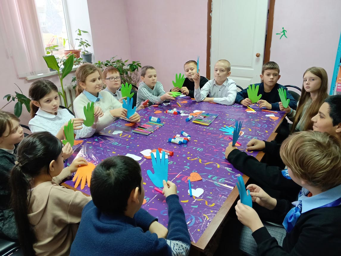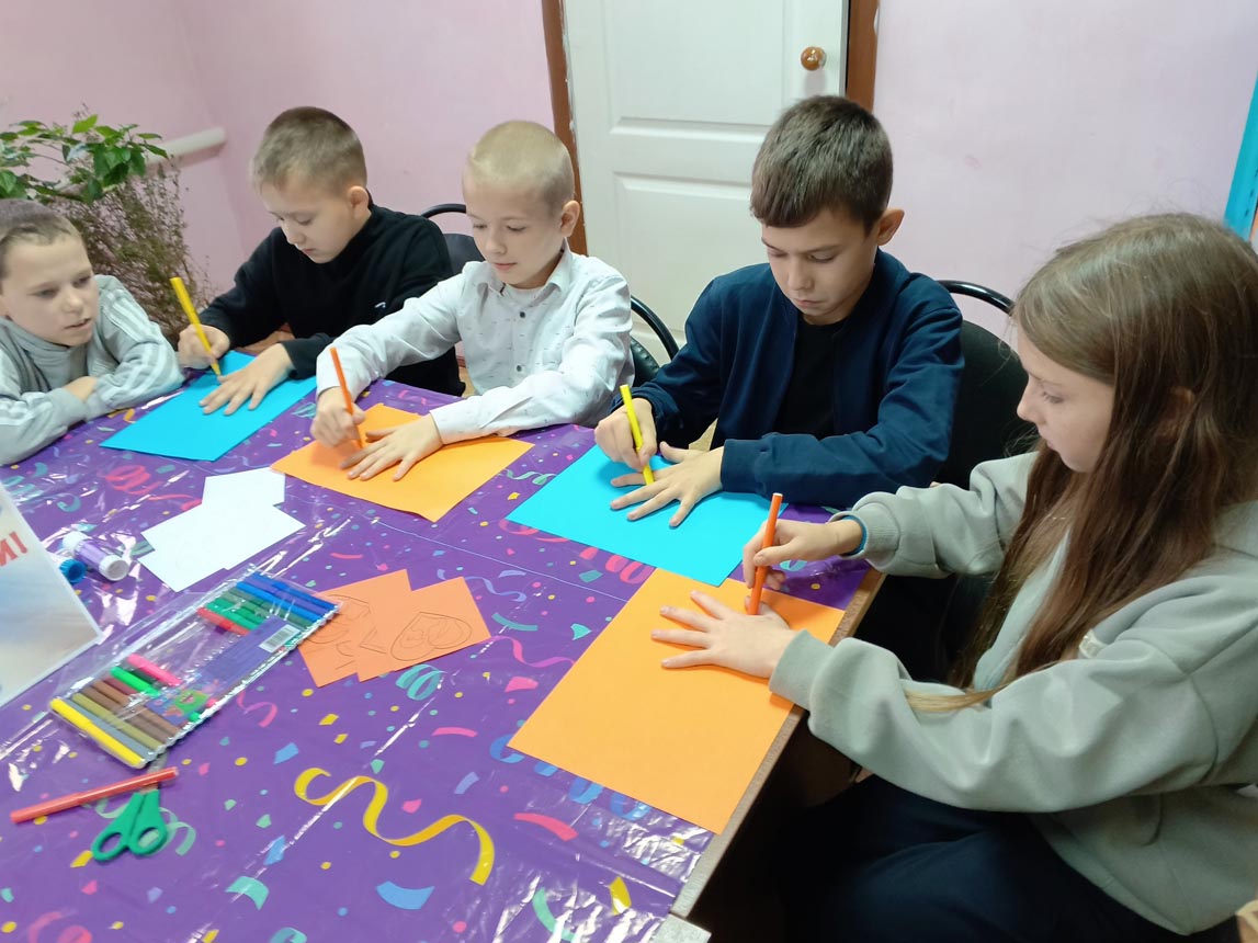 Мальчишки и девчонки с удовольствием мастерили поделку из цветной бумаги, обведя свои руки, внутри на каждой ладошке приклеили сердечки и написали теплые пожелания для своих мам.