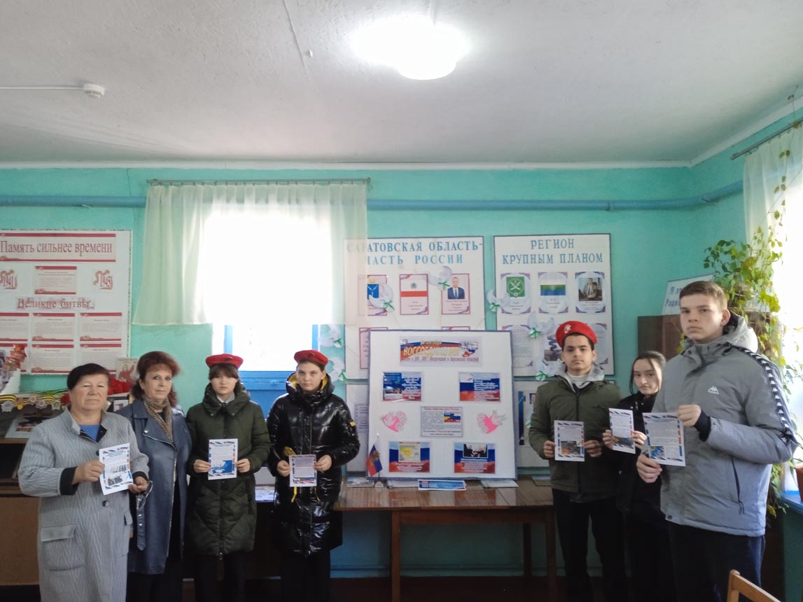 В этот значимый для всей России день Ртищевская сельская библиотека МУК «РМЦБ» провела патриотическую акцию «Вместе с Россией» для жителей посёлка. Участникам акции напомнили о событиях, связанных с вхождением новых регионов в состав Российской Федерации.