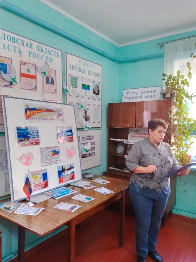 В рамках празднования этого события в Лопатинской сельской библиотеке был организован патриотический час под названием «Мы вместе! День воссоединения Донбасса и Новороссии с Россией».