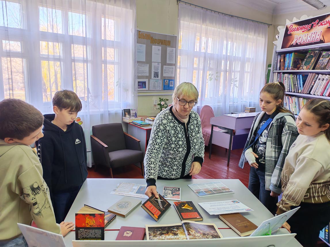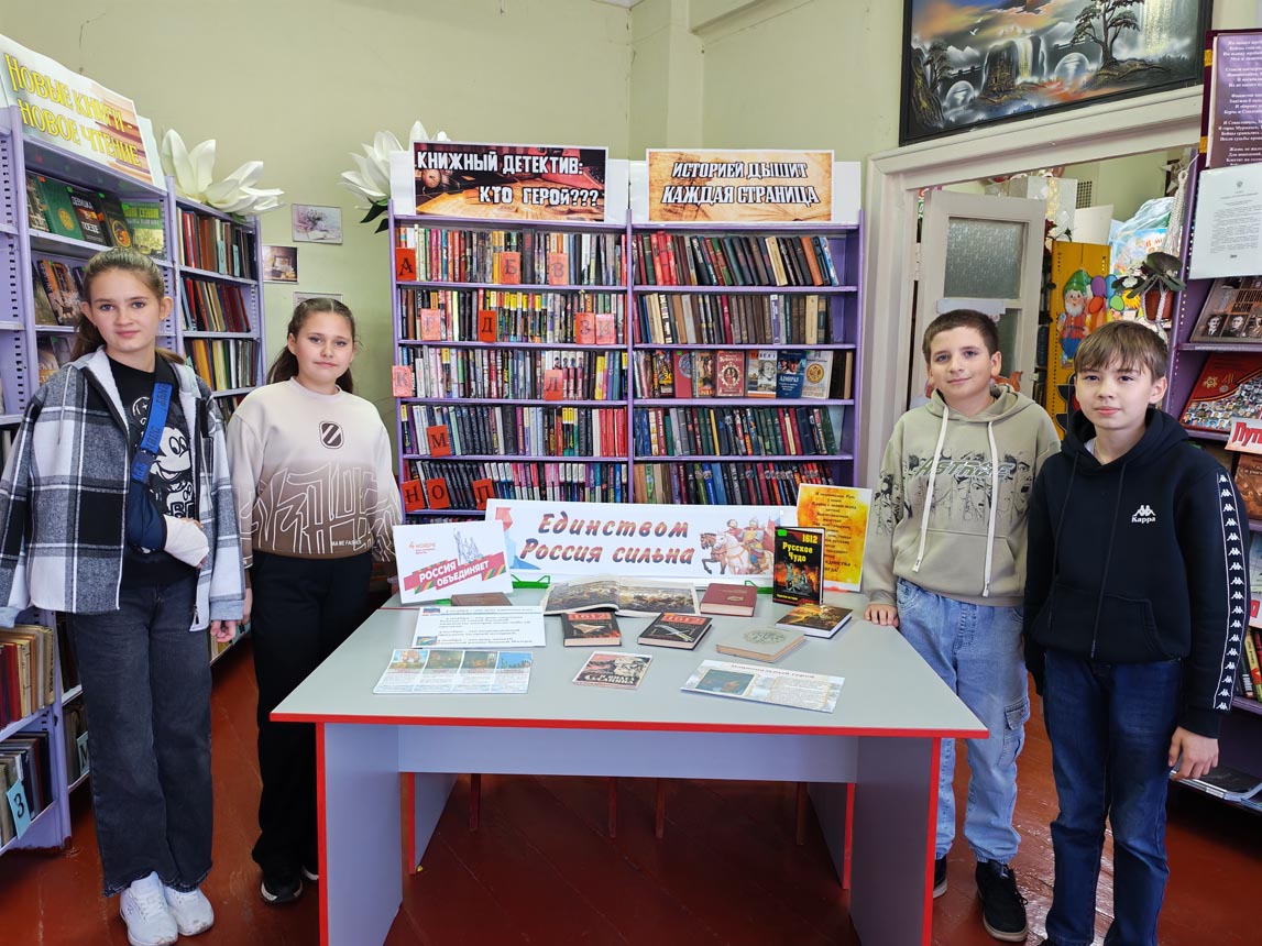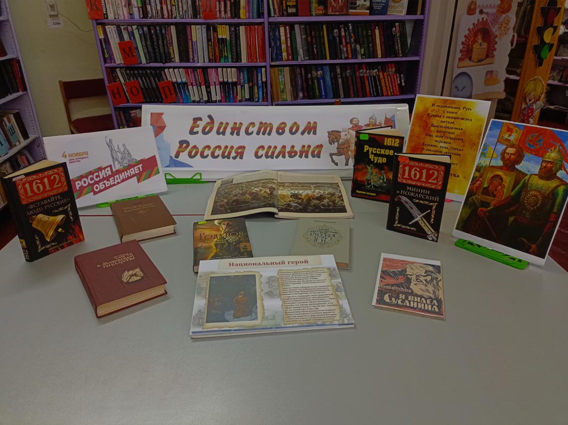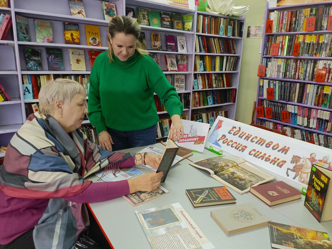 В завершение участники мероприятия познакомились с тематической выставкой, «Россия единством сильна», на которой были представлены книги по истории российского государства, о смутных временах в истории Руси, польско-литовской интервенции, о подвиге Ивана Сусанина и о том, как в годы Великой Отечественной десятки человек совершили подвиг, подобный тому, который в 1613-м совершил Иван Сусанин, заведший врагов Отечества в заболоченный лес.