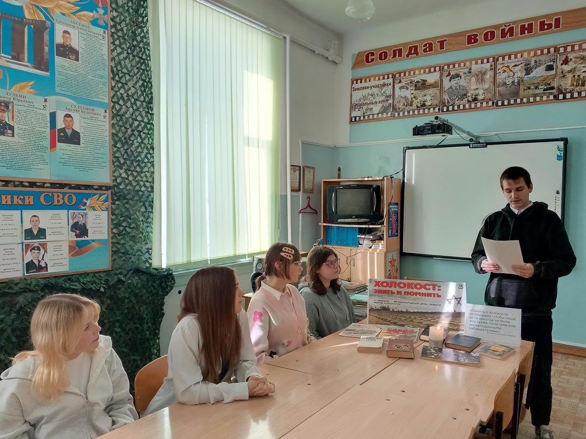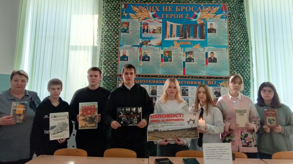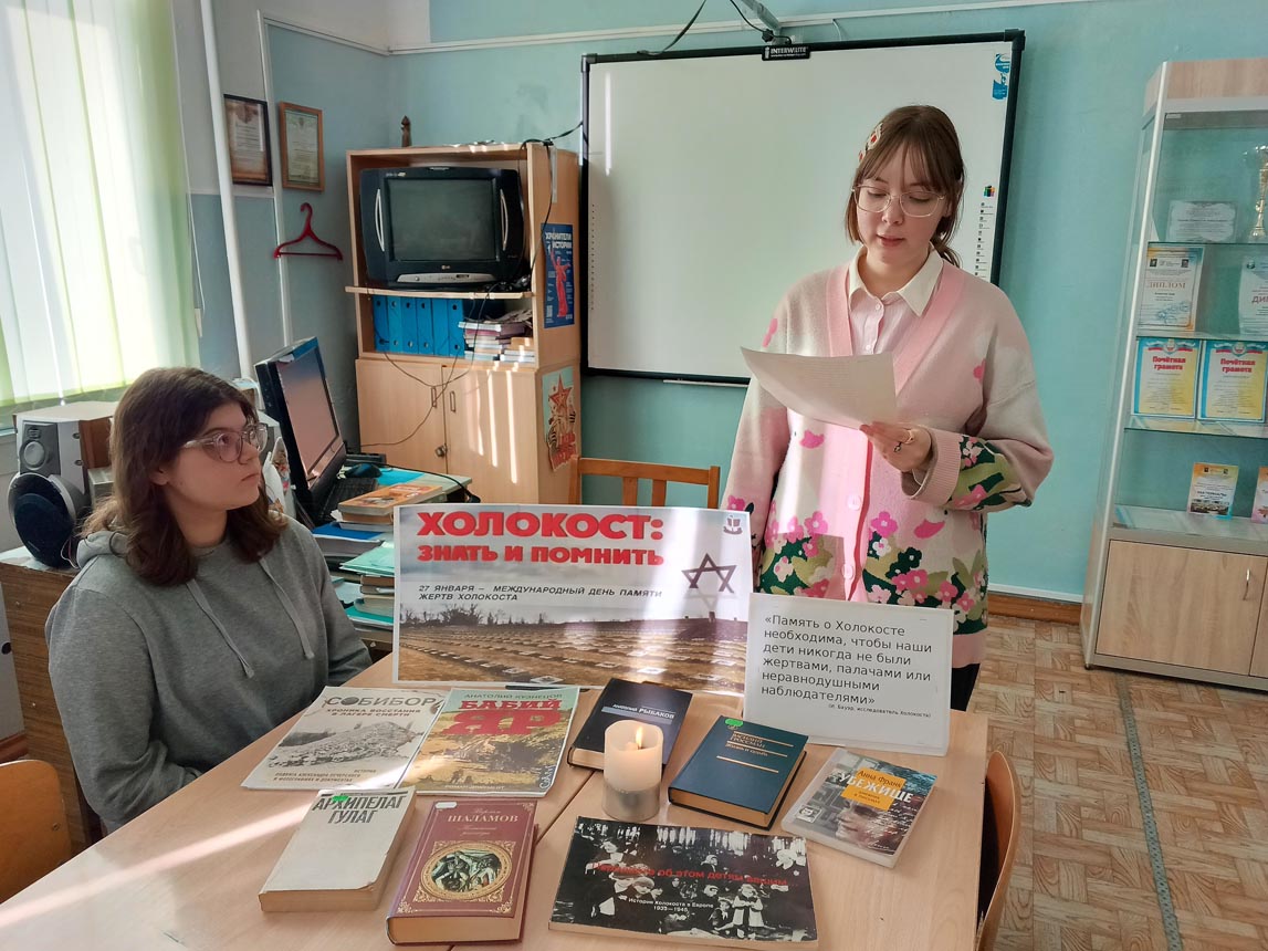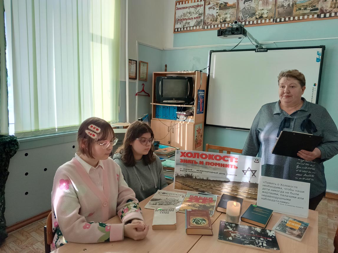 В рамках часа памяти «Холокост – преступление и наказание», организованного 27 января Шило-Голицынской сельской библиотекой МУК «РМЦБ» для учеников старших классов, прозвучало много важной исторической информации. Библиотекари раскрыли суть самого термина «холокост», ознакомили присутствующих с масштабами преступлений нацистов и представили исторический экскурс в зарождение и развитие гитлеровского режима, этапы формирования антигуманистической идеологии и кровавые последствия её воплощения.