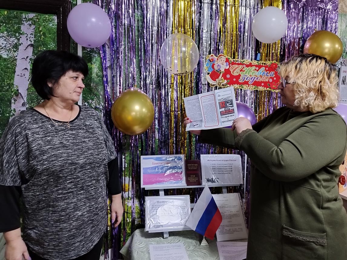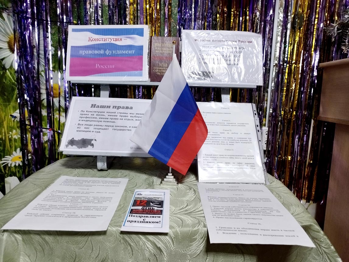 У выставки прошёл час гражданственности «Конституция – правовой фундамент государственности». Библиотекарь говорила, что по конституции, человек, его право и свободы являются высшей ценностью, познакомила с историей создания и развития Конституции РФ.