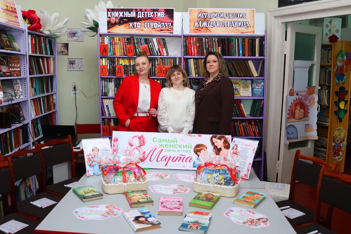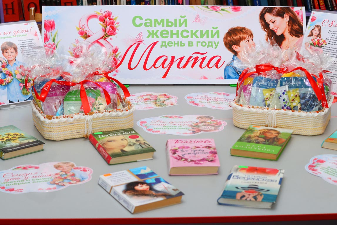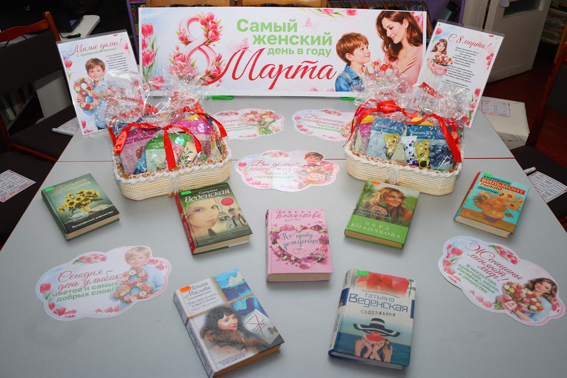 Кроме того, вниманию гостей была предложена тематическая книжная экспозиция «Самый женский день в году - 8 марта». Здесь посетители могли ознакомиться с новыми романами российских писательниц Татьяны Алюшиной, Тамары Веденской и других мастеров современной прозы, произведения которых способны тронуть сердце каждого читателя.