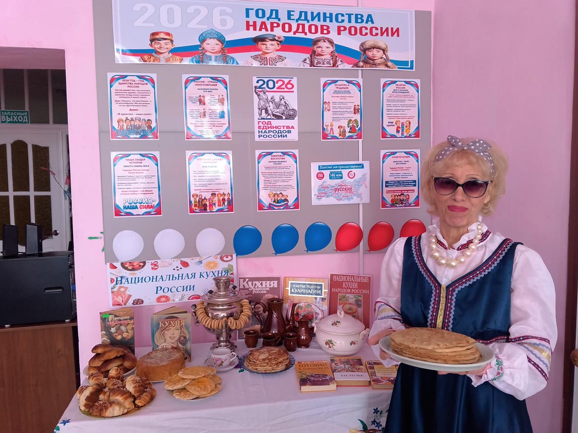 Следующим этапом стал увлекательный квест «Народов много – Родина одна», включавший интеллектуальные станции «Что? Где? Когда?» и викторину «По одежке встречают...». Участники активно участвовали в весёлых играх «Ручеёк» и «Ведьмина метла», получили заряд позитива и энергии. Параллельно работала тематическая книжная выставка «Национальная кухня России», где были представлены лучшие рецепты домашних блюд.