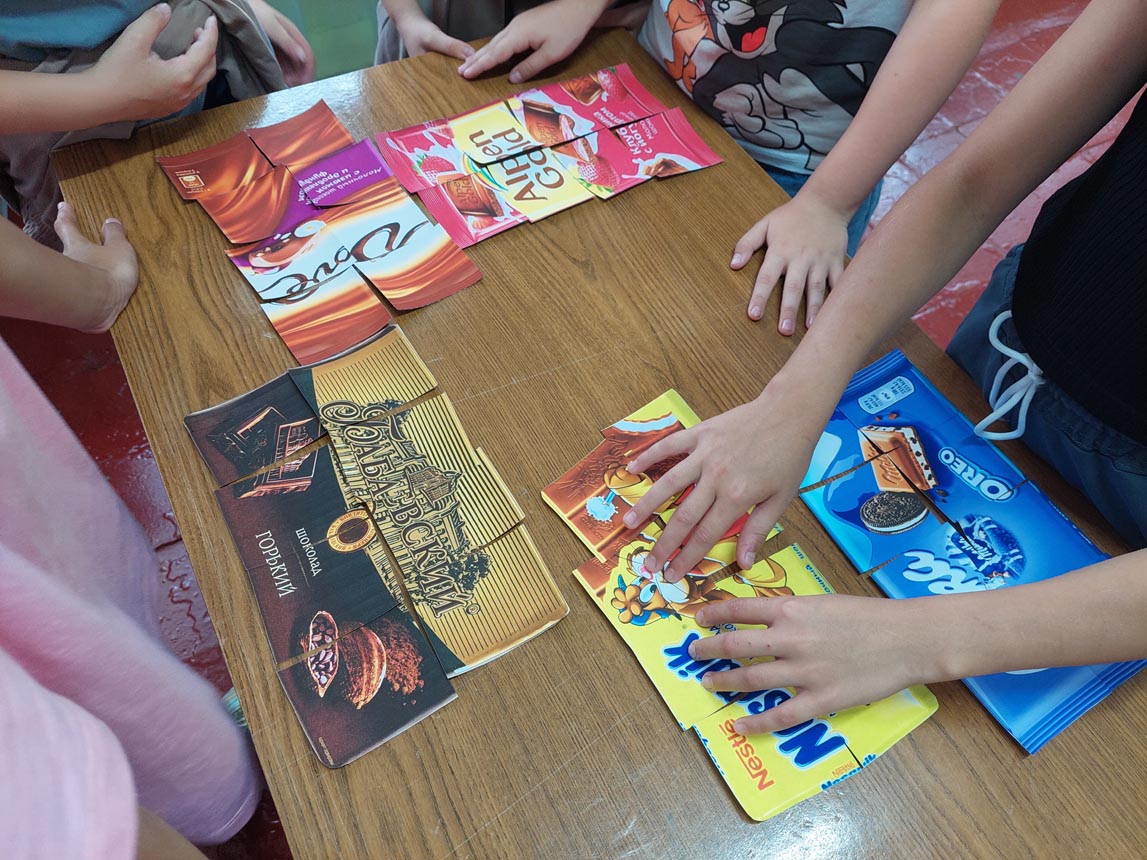 Они вспоминали литературных персонажей-сладкоежек, собирали шоко-пазлы, складывали названия известных конфет из букв, самые эрудированные читатели составляли слова из букв слова ШОКОЛАД и ответили на важные вопросы: польза и вред шоколада.