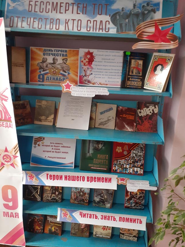 В завершении мероприятия ведущая провела обзор литературы у книжной выставки «Бессмертен тот, Отечество кто спас», познакомила с книгами о соотечественниках разных эпох и различных по званию, особое внимание было уделено тому 41 книги Памяти Саратовской области «Шагнувшим в вечность наш поклон», посвященной героизму наших земляков, отдавших жизни в ходе специальной военной операции.