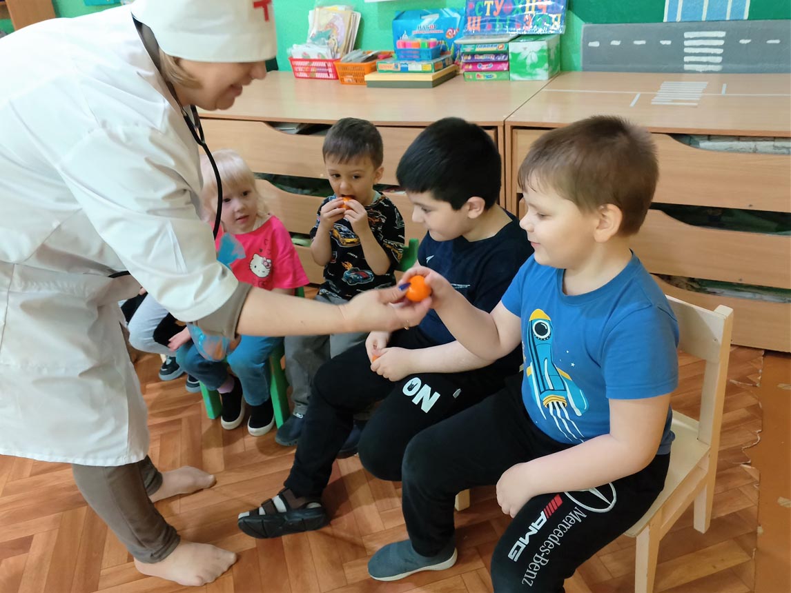 Особое внимание доктор уделил правильному питанию. Он рассказал ребятам, что витамины «живут» не только в аптеке, но и в свежих овощах и фруктах, которые дети легко угадывали по загадкам. Разговор о полезной и вредной пище закрепился в играх «Полезно и неполезно» и «Вредно и полезно».