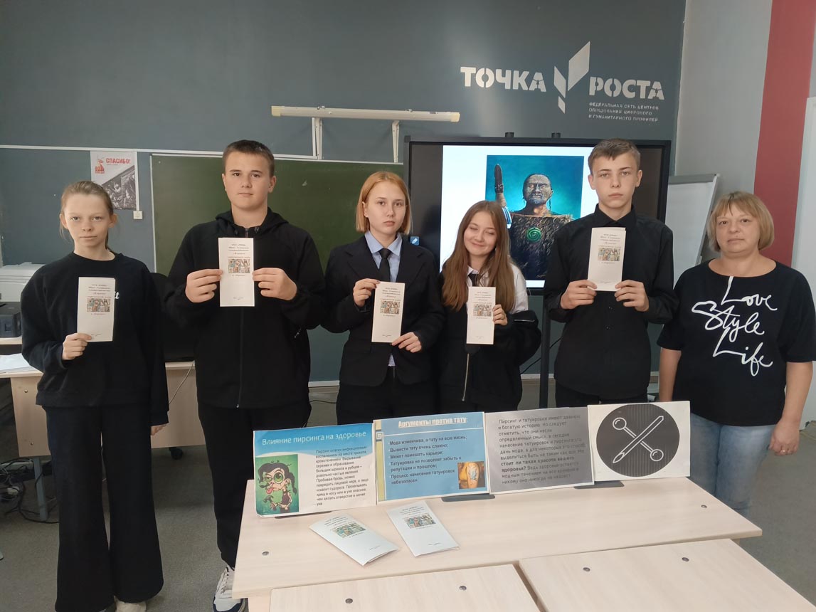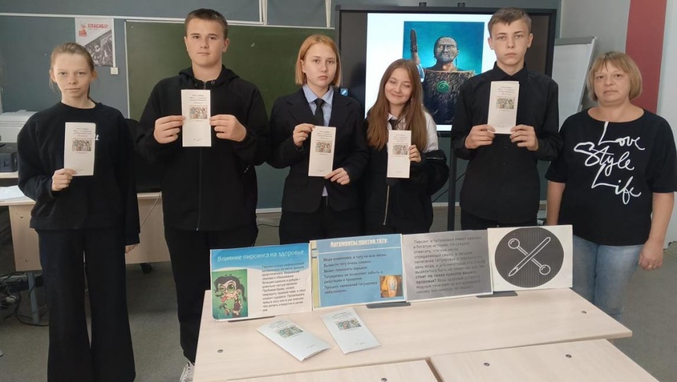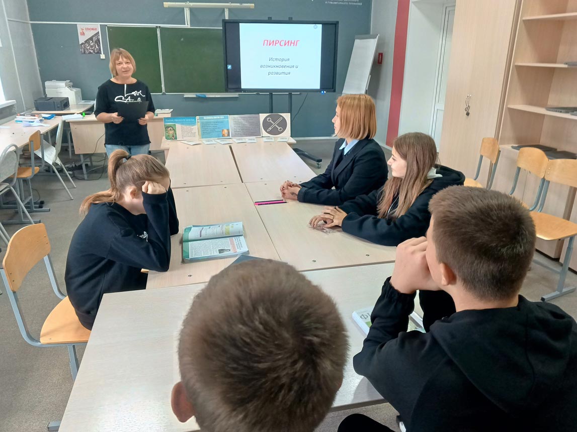Наглядным материалом на мероприятии послужили презентация «Влияние пирсинга и татуировок на организм человека», показ видеоролика «В чем вред татуировок». Ребята ответили на вопросы анкеты на заданную тему.