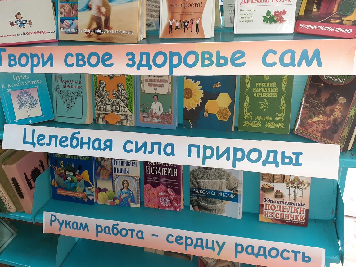 Авторы представленных книг помогут найти ответы на важнейшие вопросы о здоровье и долголетии, советы и рекомендации по правильному питанию, разумной физической активности, использованию лекарств. Посетители могут выбрать книги по вязанию и шитью, познакомиться с книгами – травниками.