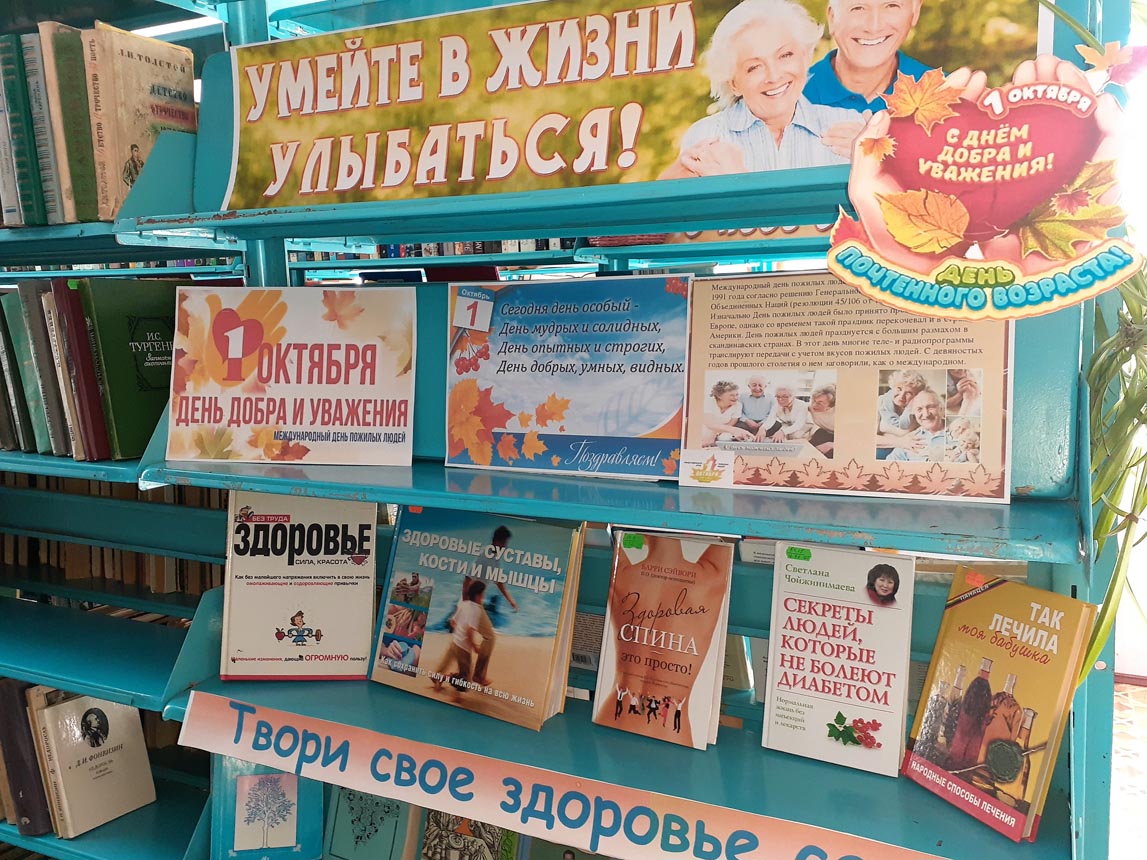 День пожилого человека принято отмечать повсеместно в первый день второго осеннего месяца — 1 октября. Дата выбрана неслучайно: бытует мнение, что старость — это золотое время, осень, как известно, тоже называют золотой порой, поэтому и было решено выделить старшему поколению специальный день в самый разгар осеннего сезона. В первый день октября во всем мире принято звонить своим бабушкам и дедушкам, мамам и папам, чтобы просто в очередной раз сказать им, как сильно вы их любите, и поделиться последними новостями. Шило-Голицынская сельская библиотека МУК «РМЦБ» подготовила книжно-иллюстративную выставку «Умейте в жизни улыбаться!». Люди старшего поколения, воспитанные книгой, остаются верными ей на протяжении всей жизни.