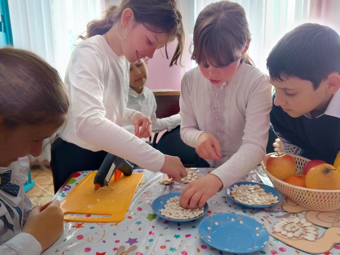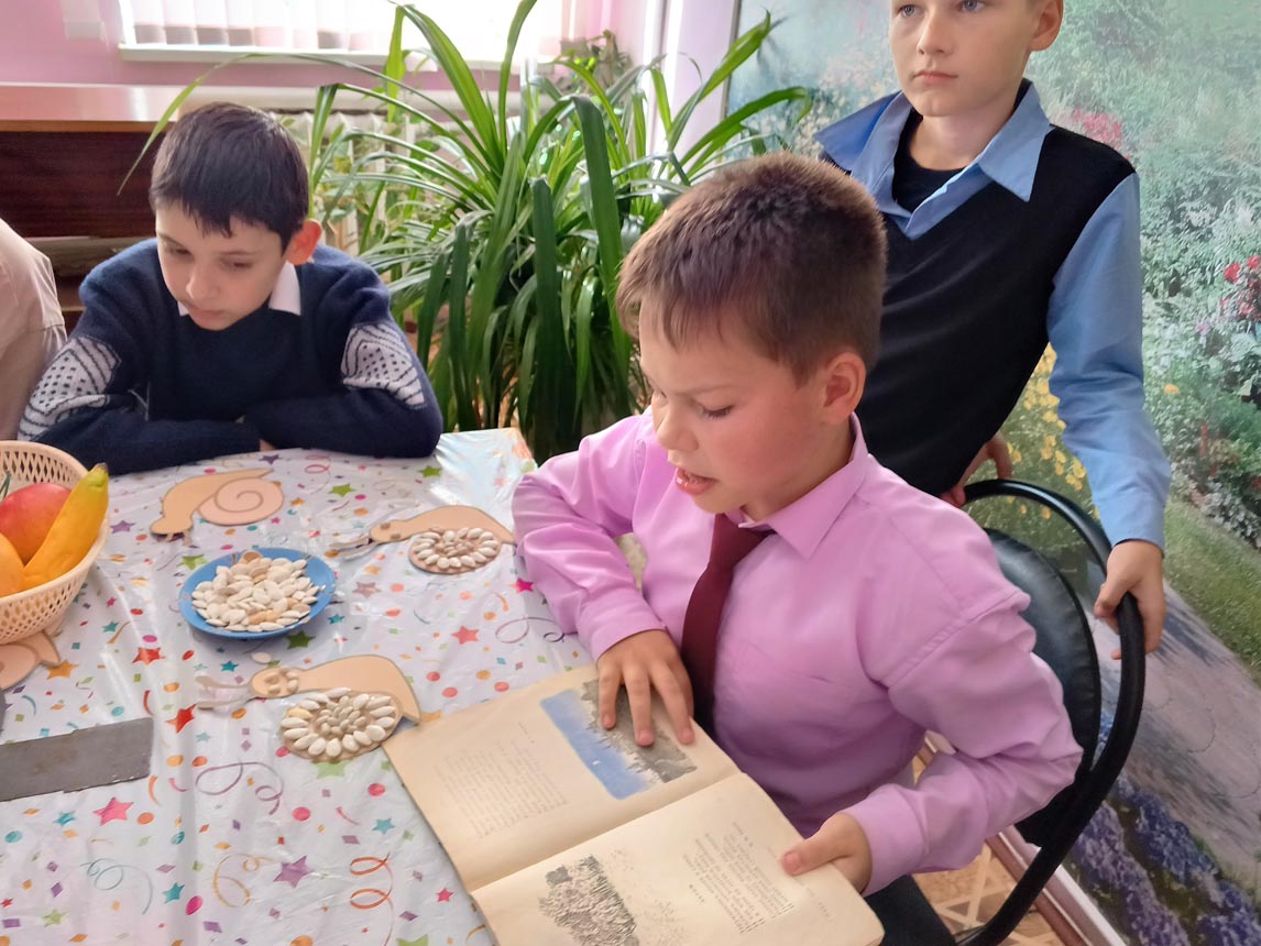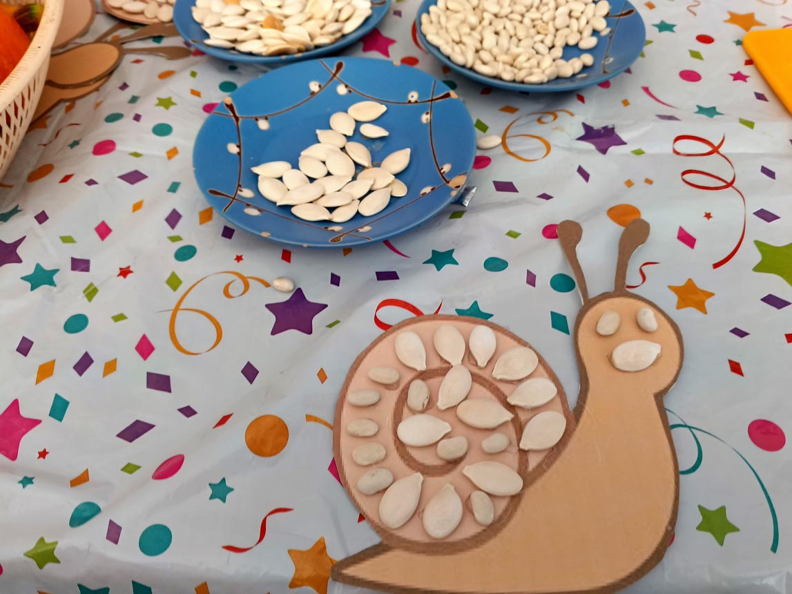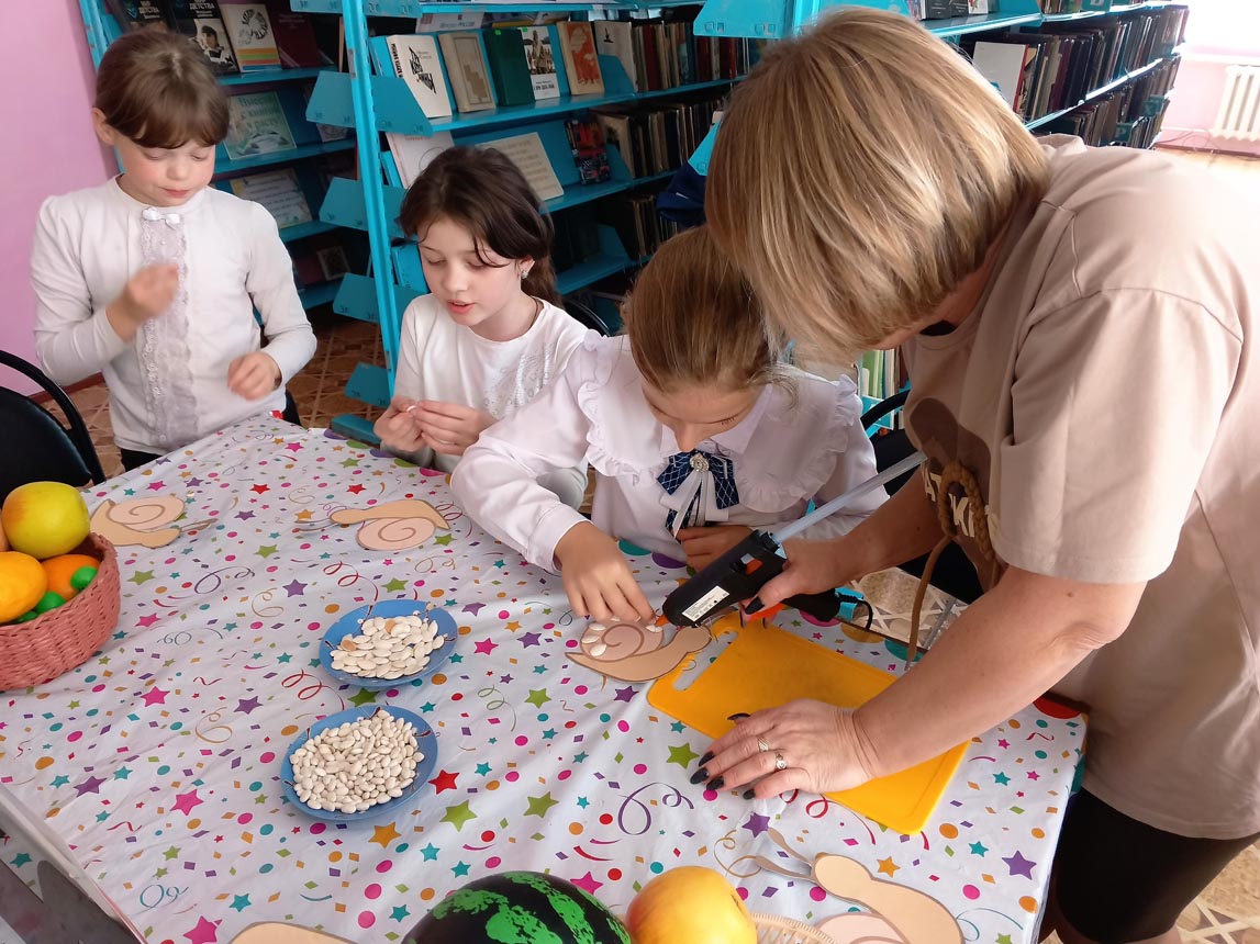 Ведущая рассказала о прекрасном времени года – осени, вспомнили поговорки, приметы, почитали стихи об осени А. А. Фета, Ф. И. Тютчева, А. С. Пушкина. Затем приступили к мастер-классу, детям было предложено изготовить поделку-улитку их фасоли. Каждый ребенок получил заготовку из картона для улитки, на домик улитки с помощью термоклеевого пистолета приклеивали фасолины, тыквенные семечки, так, чтобы получился спиральный узор. Каждый ребенок проявил, старание, усидчивость. Поделки из фасоли помогают развить мелкую моторику и воображение. Оказалось, что изготовить необычные красивые осенние поделки совсем несложно. Нужно лишь немного терпения, внимания, и усидчивости – результат будет радовать глаз всю долгую холодную зиму.