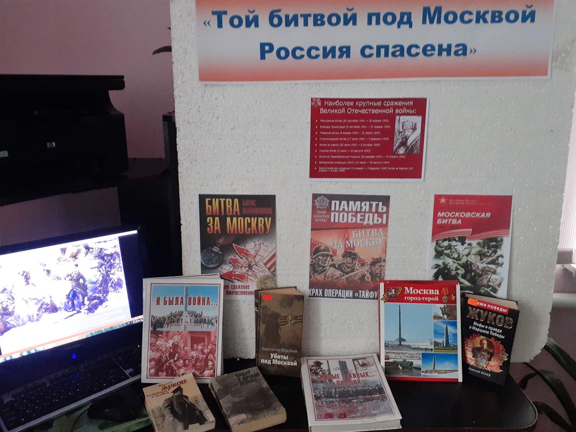 5 декабря — День начала контрнаступления советских войск против немецко-фашистских войск в битве под Москвой в 1941 году. В эти декабрьские дни мы вспоминаем эту битву, ее героические страницы. Битва за Москву — крупнейшее сражение в рамках второй мировой войны. Советским войскам впервые удалось остановить массированное наступление немецких войск и создать предпосылки для дальнейшего контрнаступления. Шило-Голицынская сельская библиотека МУК «РМЦБ» организовала и провела для старшеклассников МОУ «Шило-Голицынская СОШ» урок мужества «Война стояла у ворот столицы».