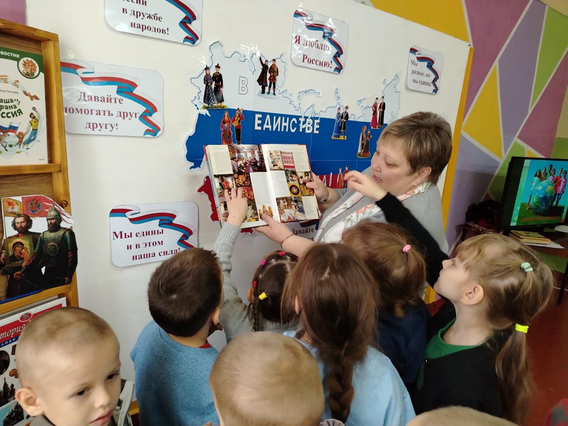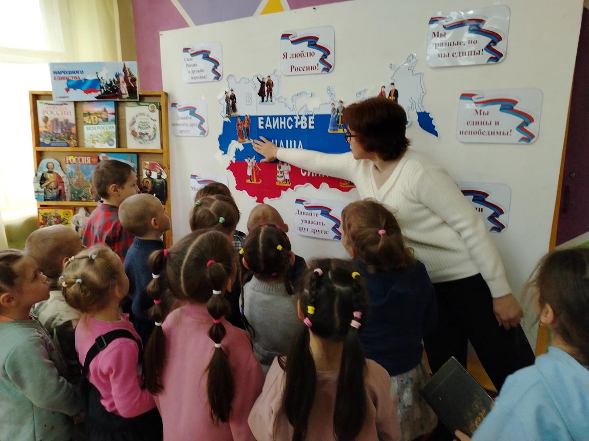 День народного единства. Этот день занимает особое место среди государственных праздников современной России. В преддверии этой знаменательной даты городская библиотека №3 МУК «РМЦБ» для воспитанников детского сада № 14 «Солнышко» подготовила тематическую программу «Все мы разные, а Родина одна».