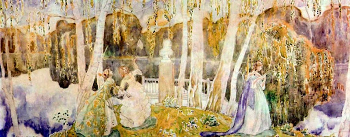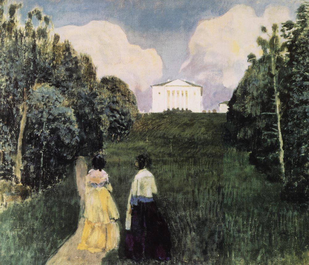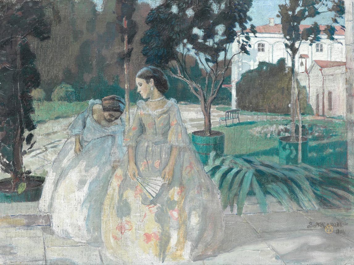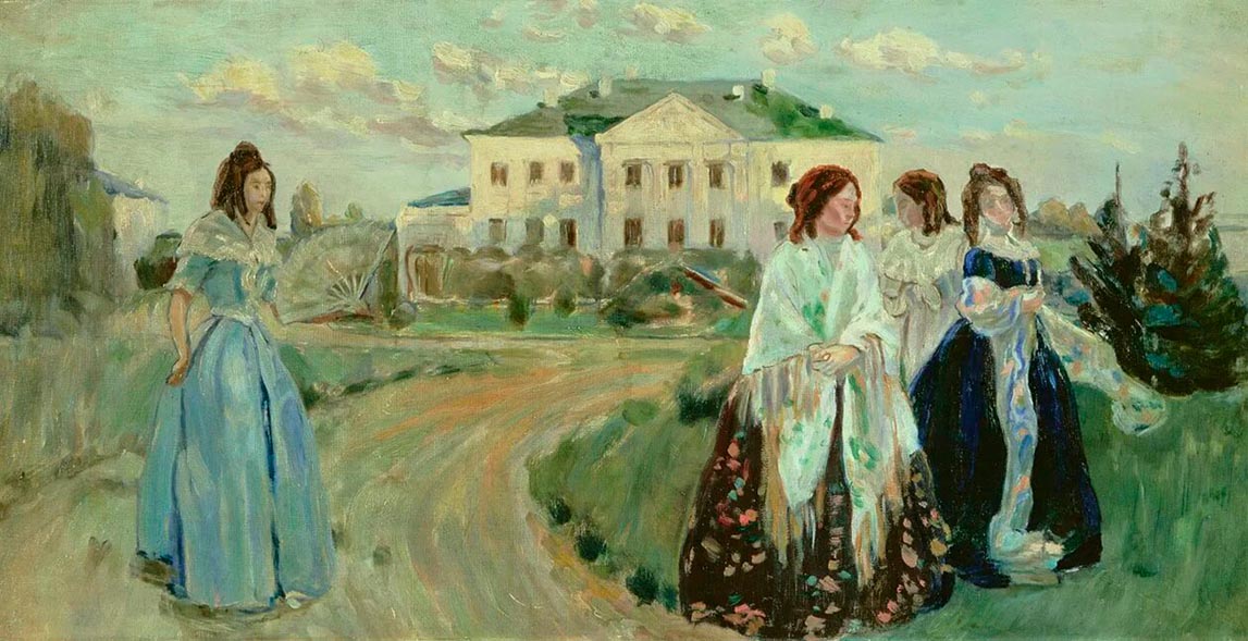В 1903 году, вдохновлённый саратовскими пейзажами и атмосферой заброшенных усадеб, Борисов-Мусатов пишет два программных полотна: «Прогулка при закате» и «Призраки». На них девушки в старинных платьях и с причёсками прошлого неспешно гуляют по пустынному парку. Художник не стремился к исторической точности: «Да никакая это эпоха! Это, знаете ли, просто красивая эпоха», — говорил он, подчёркивая ностальгический характер своих образов.