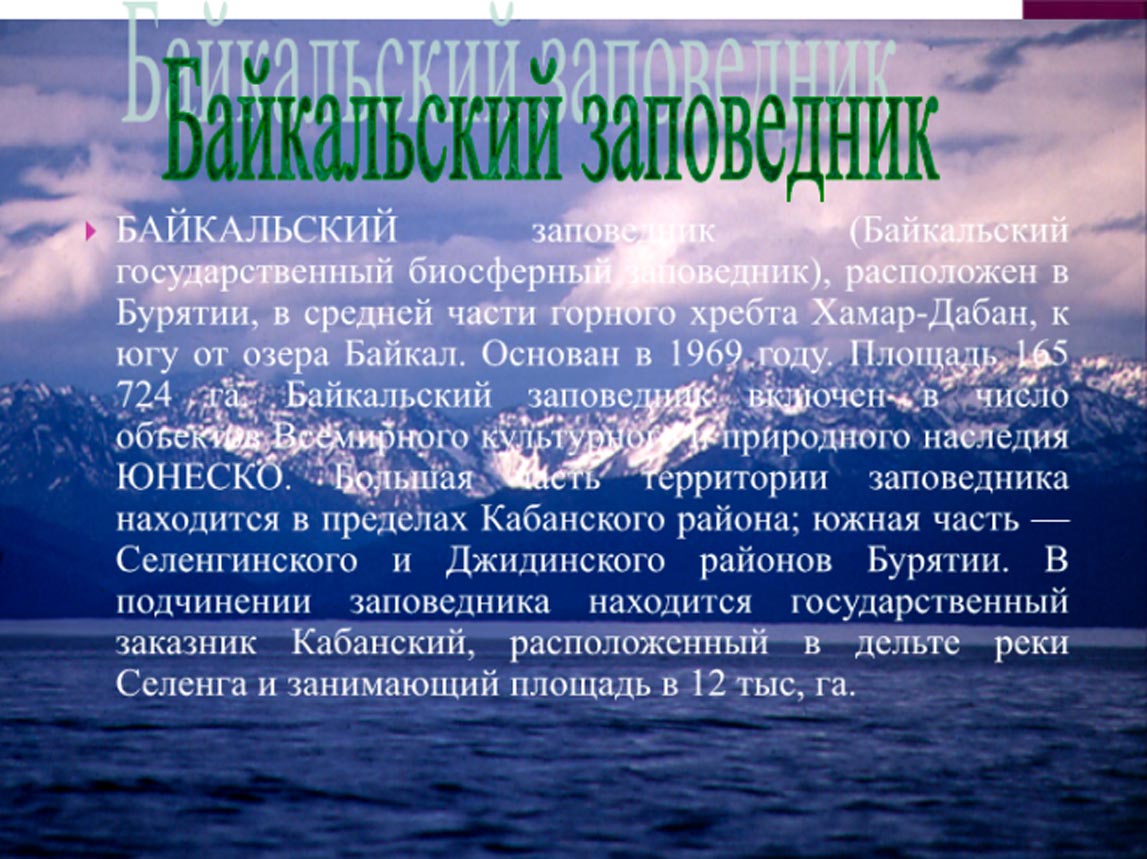 26 сентября 1969 года был образован Байкальский государственный природный биосферный заповедник. Байкальский государственный биосферный заповедник – это особо охраняемая зона, которая находится в южной части озера Байкал. Заповедник на этой территории был создан для охраны, сохранения и изучения уникальной природы Байкала. Благодаря работе заповедника, до настоящего времени сохранена значительная часть экологической системы хребта Хамар-Дабана, а также деятельность природного комплекса направлена на восстановление исчезающих видов представителей животного и растительного миров.